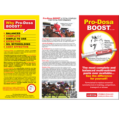 Pro-Dosa BOOST MULTI-NUTRIENT PASTE Pro-Dosa BOOST is a cost effective, simple to use, less invasive alternative to traditional pre-race and recovery treatments which can be expensive and stressful for the horse. (Pro-Dosa BOOST replaces the administration of electrolytes by stomach...